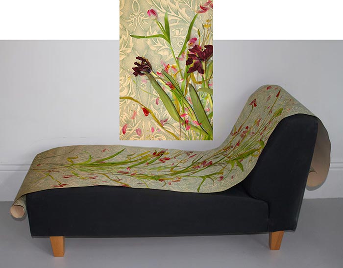 Finding that no London flower shop sells wild tulips, Sue gets bog-standard Dutch ones, drapes Morris wallpaper over a couch and lays the wilting tulips on it. Then photographs their recline, decline and fall.”