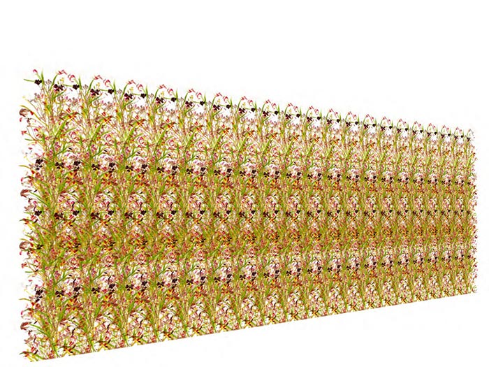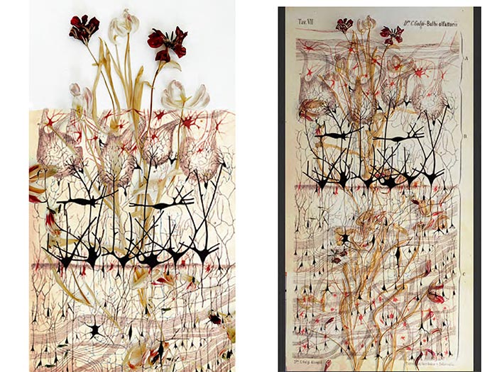 “ - Dreaming about the scent of flowers (standard tulips have none), Sue wanders through neural forests drawn by Camillo Golgi and plants olfactory bulbs among her tulip patterns, which grow agitated.”